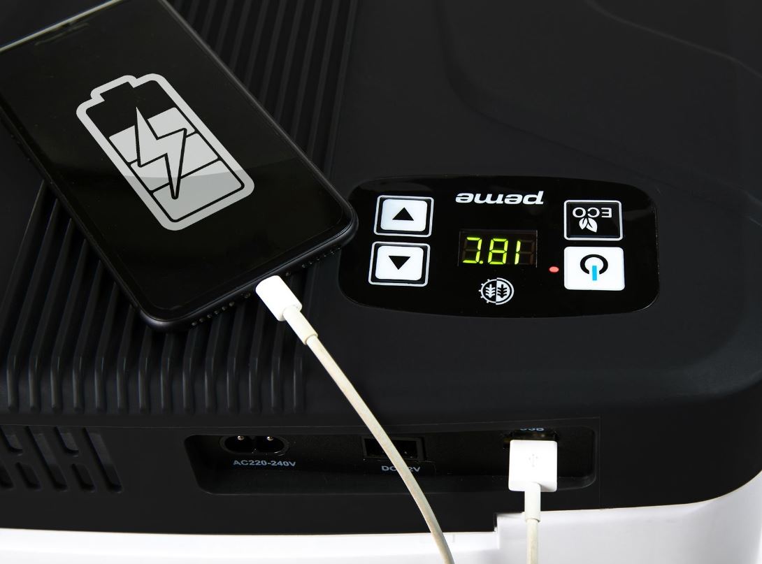 Podczas podróży samochodem i podłączenia lodówki do zapalniczki samochodowej nie musisz już o martwić się o ładowanie telefonu, dzięki wbudowanemu gniazdu USB.