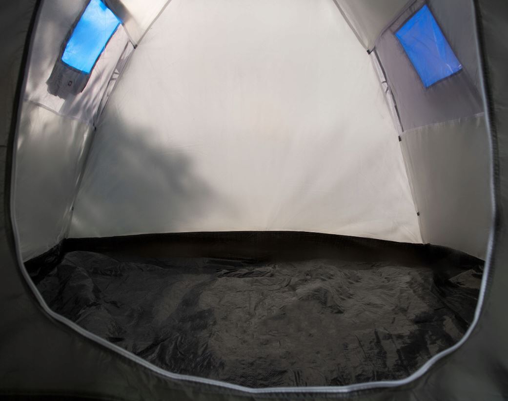 Sypialnia z oddychającego poliestru umieszczona pod tropikiem. Unikniesz kontaktu z kroplami wody, wszystkie wejścia są rolowane i zamykane na suwak dwustronny.