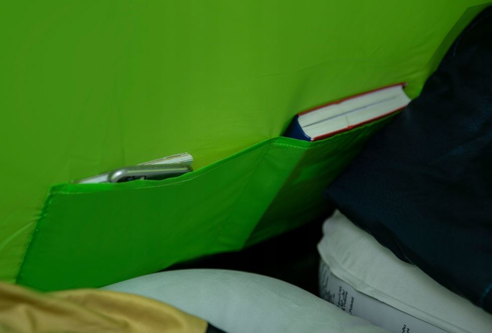 Umieszczenie w sypialni kieszeni pozwala na lepszą organizację najpotrzebniejszych przedmiotów, a uchwyt na lampę zapewni doskonałe oświetlenie w całym namiocie.